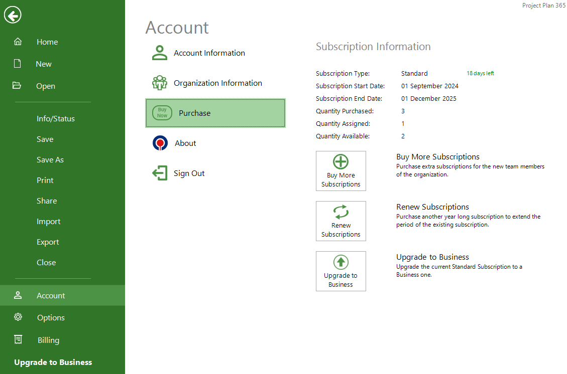 You can also renew the Standard Subscription directly from our Project Plan 365 app. Go to File menu – Account – Purchase and click the Renew Subscriptions button. Then, follow the steps mentioned above.