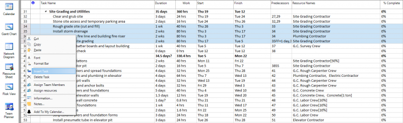 3. As a result, four new tasks will be inserted at the same time above the task with ID = 27 (Rough grade site (cut and fill)) - in the above print screen, and the below tasks will have their IDs renumbered.