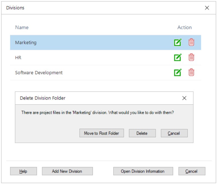 4. If you have projects that belong to the selected division, you will be asked if you want to delete them all or moving them to the root folder.