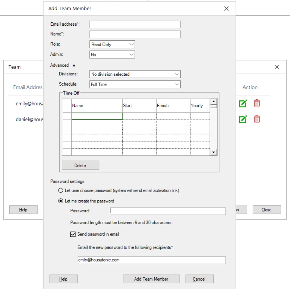 To add a team member to a division, go to File menu – Account - Organization Information, then click Divisions. In Divisions dialog, click Edit icon for that division. Add the team member by choosing him from the drop-down list. The Name and E-mail for the team members have dropdowns with strict autocomplete.