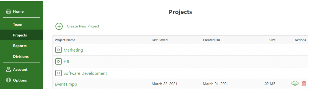 5. Projects dialog will be displayed, and you can view in the division’s folder all the projects that belong to that division.