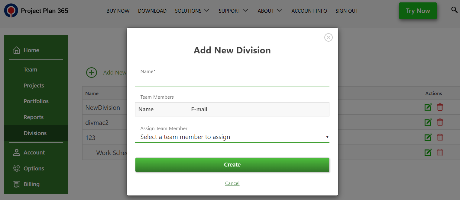 There are two ways to create a new division in Project Plan 365 app. One way is by creating it from the Divisions dialog: