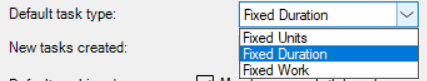 11. Default task type - specifies the default task type: Fixed Units, Fixed Duration, Fixed Work.