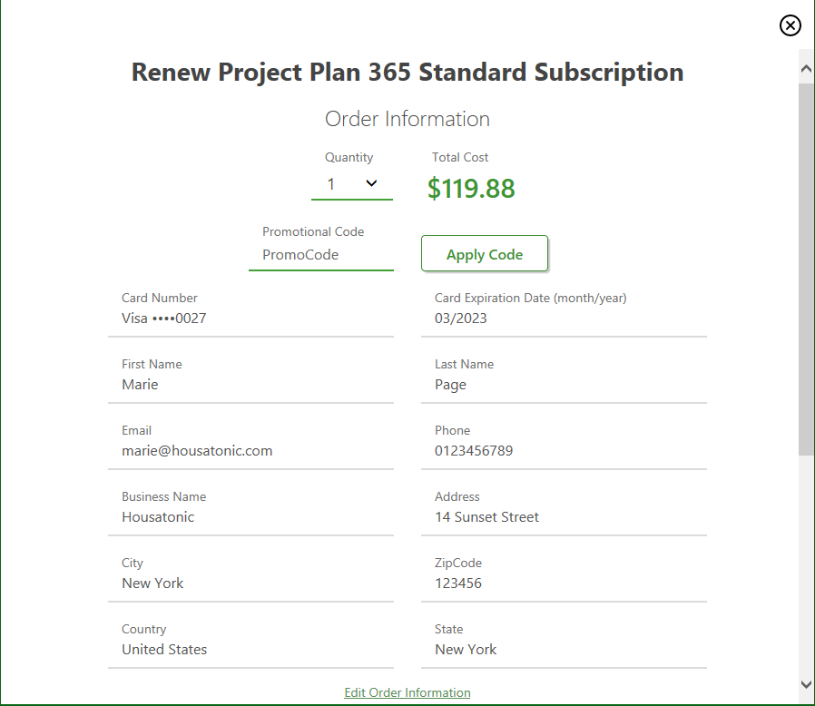To edit your payment information, please go Project Plan 365 Portal - “Billing” tab and in the Billing Information section click the “Edit Billing Information” button. Edit the fields you want and then click the “Save Billing Information” button.