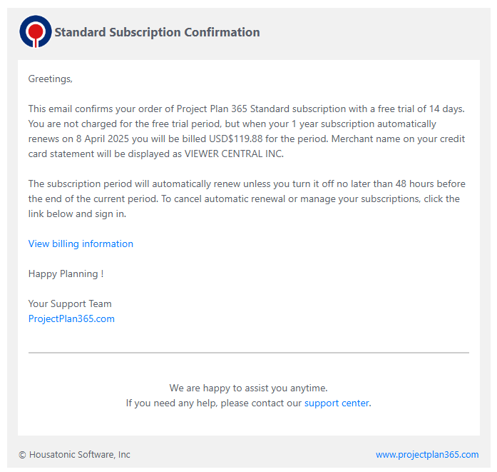To start the Standard Trial using a credit card, please go to our Project Plan 365 Free Trial page and click on the “Start free trial” button. Type your email address and a password, select the Standard Subscription option from the Summary panel, then click on the “Continue” button. Once you created your account, fill in all the required information and a valid credit card number then click on the “Start trial” button for your 14-day Standard Trial to start.