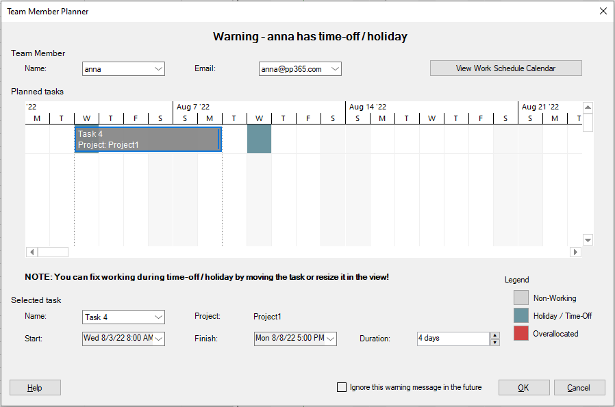 When assigning a team member to work on a task during a time-off / holiday, a warning will appear that will open the Team Member Planner dialog with time off/ holiday details on the team member’s assignment. Select the task only from the current project and change the start / finish dates and duration from the “Selected task” section to fix the scheduling issue.