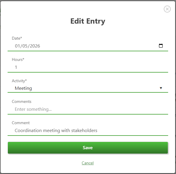 The "Time Entries" functionality allows you to record, track, and review the hours worked by you and your team members across projects and activities. It provides visibility into how time is spent and helps teams monitor workload, productivity, and effort distribution.