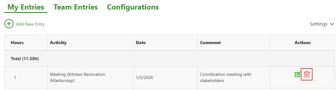 To delete a time entry, go to the My Entries view, click the Delete icon next to the entry, and confirm the action.