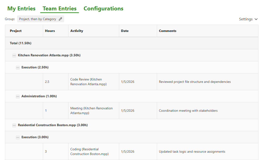 In Team Entries view, click Settings and select the desired grouping order. You can group entries by Category, Activity, Team Member, and Project, with up to four grouping levels.