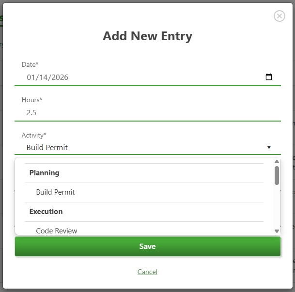 To add a new time entry, in our Online Portal go to the Time Entries page, stay in the My Entries view, click the Add New Entry button, complete the required fields (Date, Hours, Activity), and click Save.