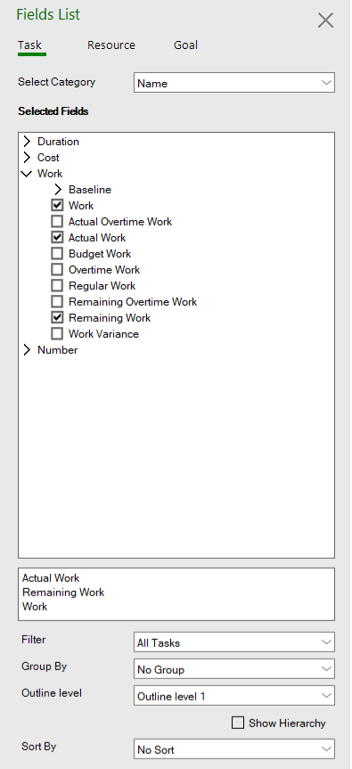 5. Click on the chart to open the Fields List panel where you can select the criteria type, fields category, which fields to be shown in the chart, rearrange the fields order, apply filters, group by, select outline level and sort.