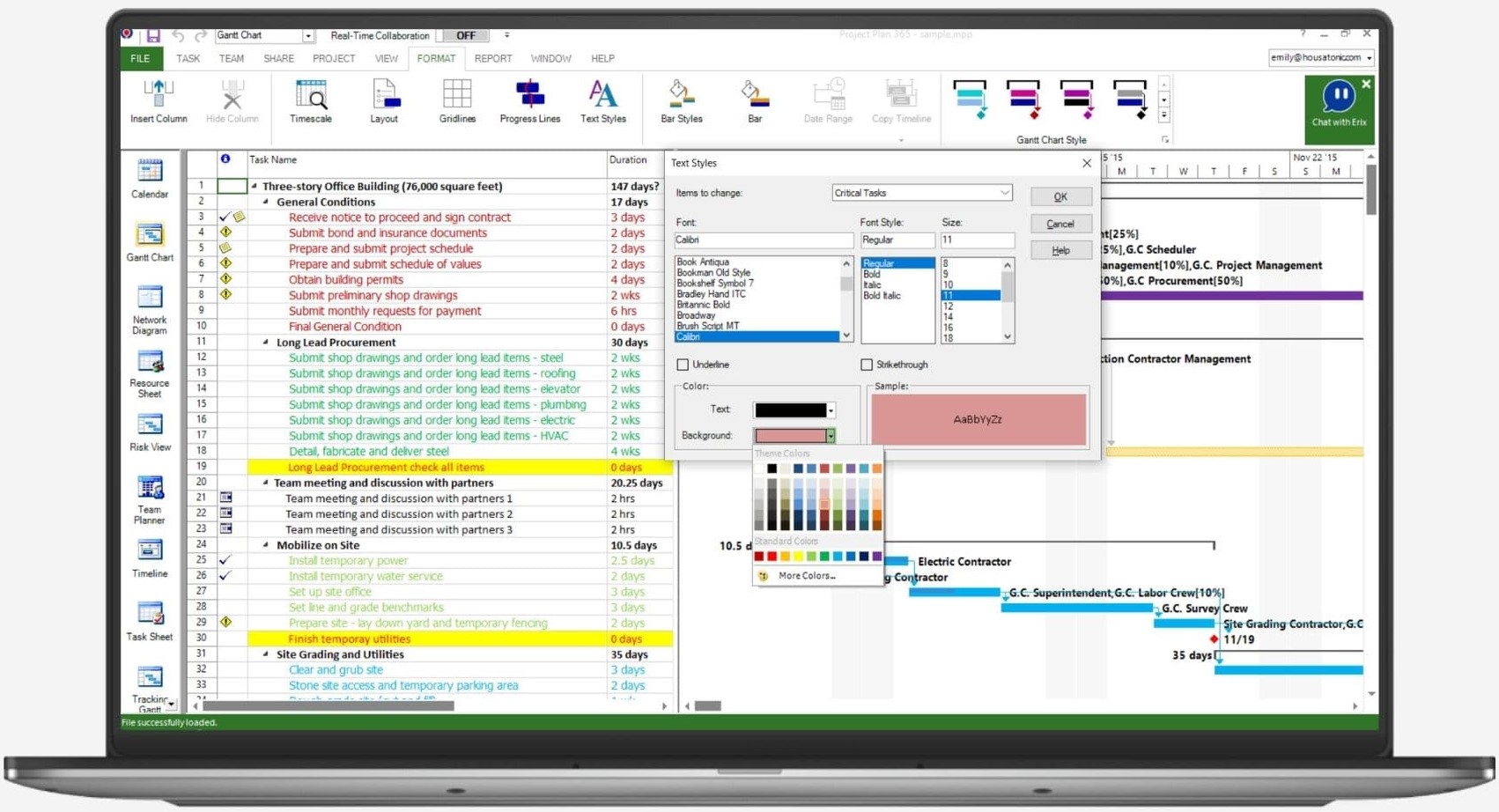 Project Plan 365 provides the Font Text Style functionality which allows you to modify the font, font size, and color of the selected cells in your Microsoft Project .MPP files.