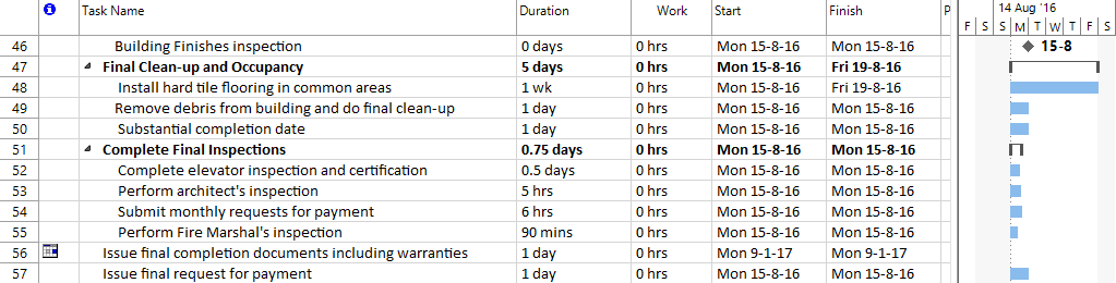 1. Select the task with ID = 7 (Submit monthly requests for payment) using the Copy command and paste it before task having the name 'Perform Fire Marshal's inspection' (it can be found under the summary task called 'Complete Final Inspections'). To do this, select the task 'Construction final notice' and then click on Paste option from the Task menu.